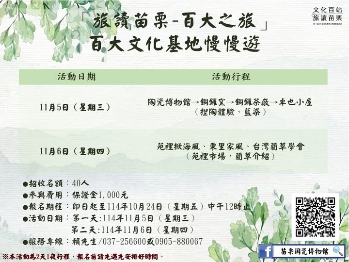 「旅讀苗栗-百站之旅」百大文化基地漫漫遊報名簡章