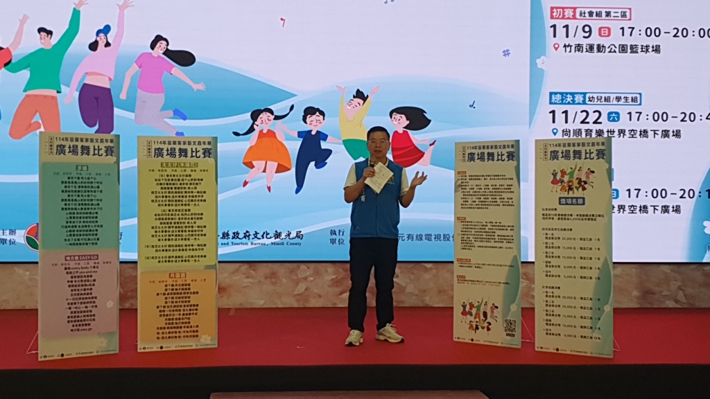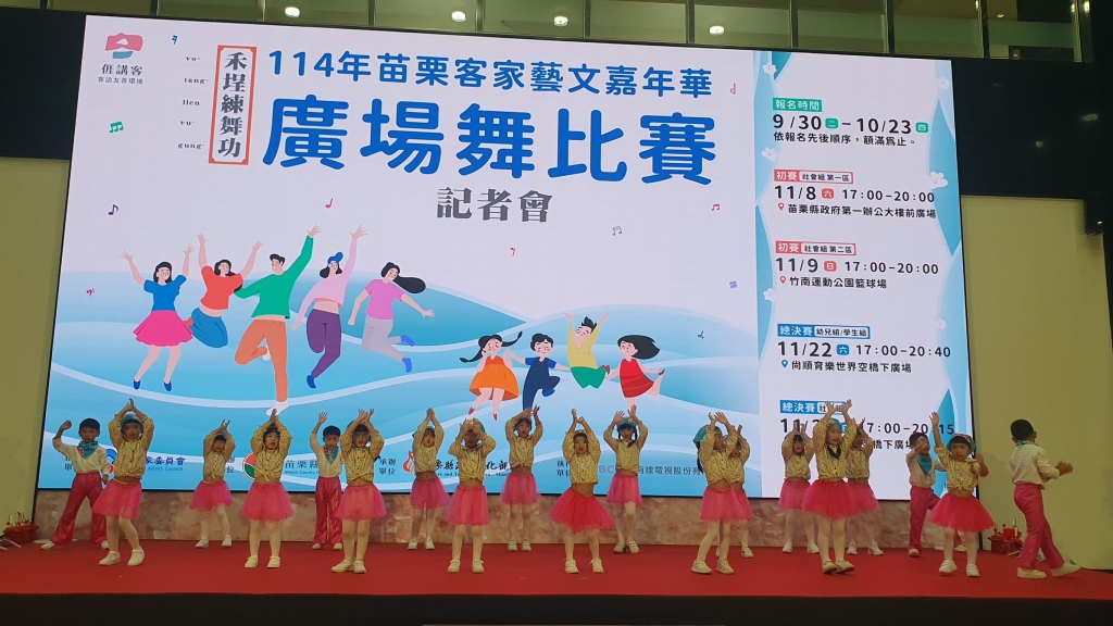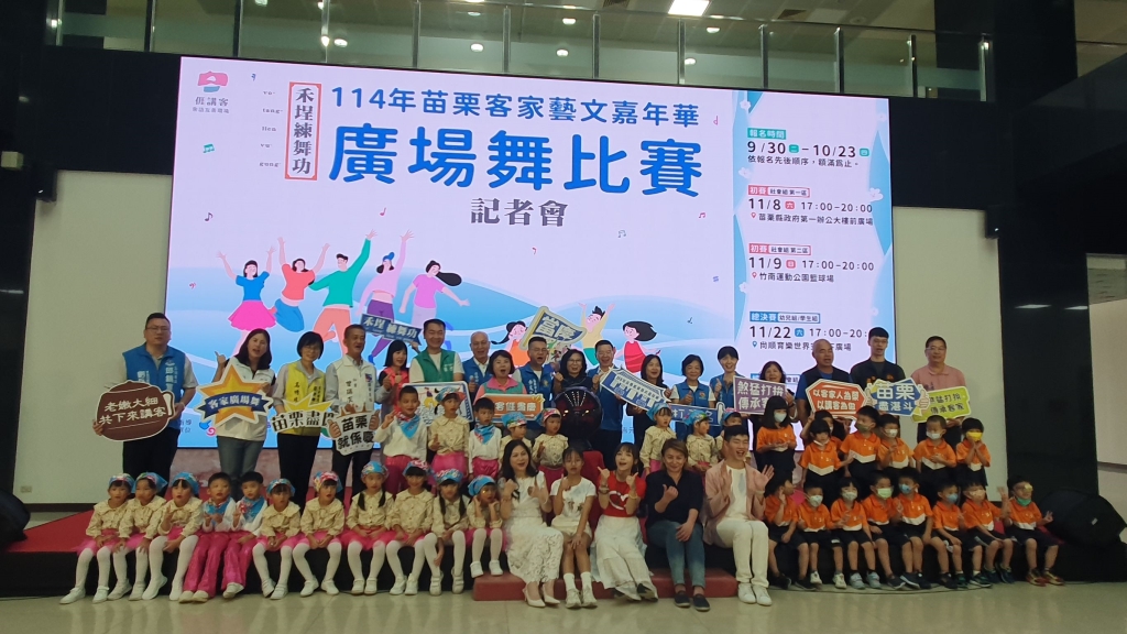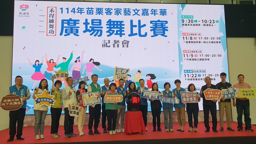 「114年苗栗客家藝文嘉年華-廣場舞比賽」即將於11月22、23日在頭份尚順育樂世界空橋下廣場登場!苗栗縣長鍾東錦23日啟動活動,並宣布9月30日開始報名到10月23日截止,而今年更是首度增設社會組初賽,邀請大人細子遽遽組隊參賽,以熱情、活力與創意舞出健康,展現苗栗客家精神。