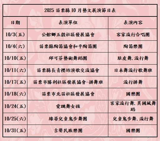 為提供縣內藝文團隊展現才華機會,並增進民眾欣賞多元表演的文化體驗,苗栗縣政府文化觀光局今年援例於1月3日起至12月31日(每週五、六)晚上7時至8時,在苗栗後火車站西站外廣場舉辦藝文展演,10月安排公館鄉五穀社區發展協會、苗栗市勝利社區發展協會、綠蒂兒童鬼步舞團等團隊,呈現客家流行歌舞、爵士樂團等多元表演,歡迎民眾踴躍前往觀賞。