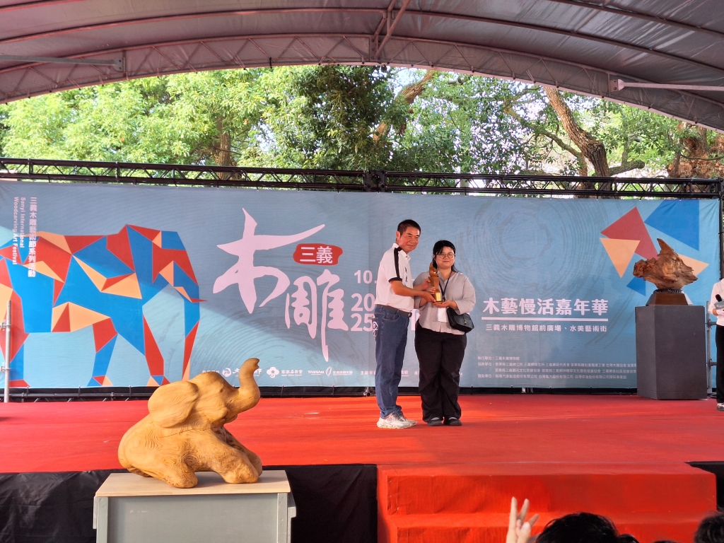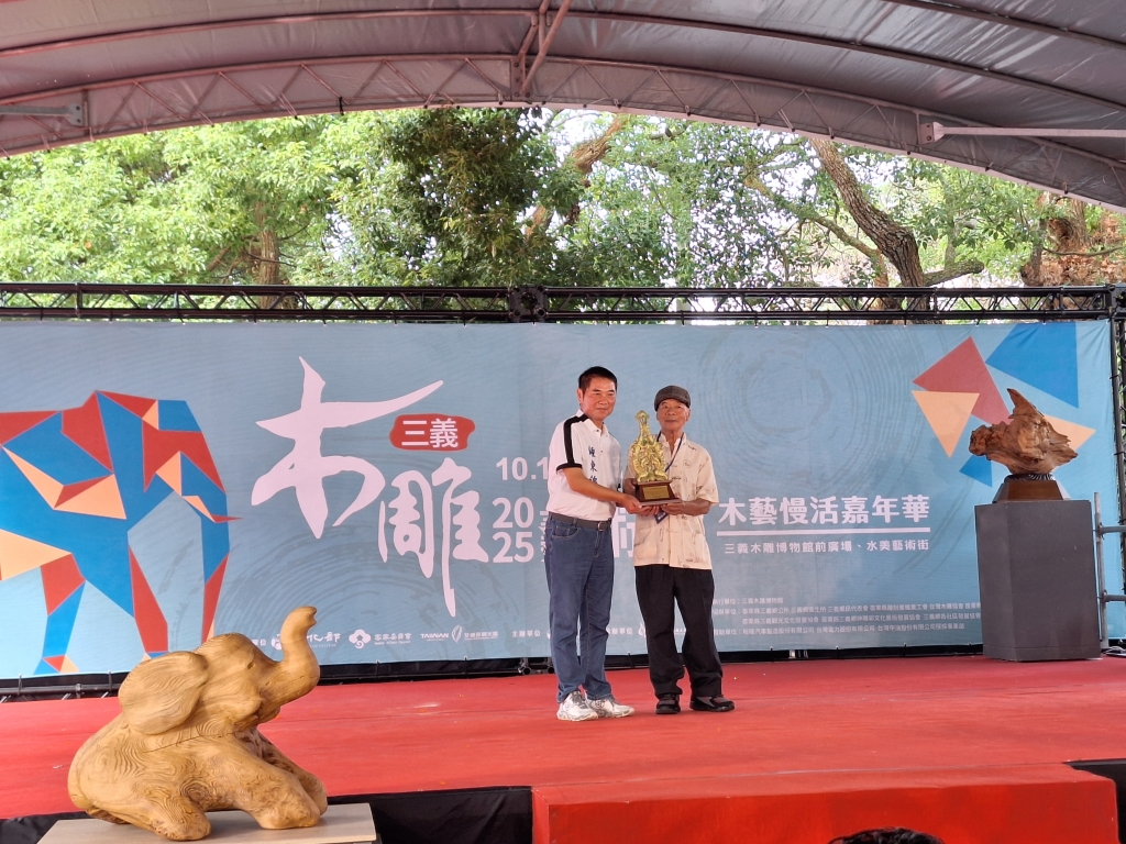 下午3時的重頭戲-2025三義木雕藝術節系列活動開幕暨頒獎典禮,苗栗縣鍾東錦縣長親臨現場,與各界貴賓共同參與,宣告「2025三義木雕藝術節系列活動-木藝慢活嘉年華」正式開始。邀請縣長與貴賓揭曉並頒發「2025臺灣國際木雕競賽」、以及「臺灣木雕薪傳成就獎」得主,以及社區才藝競賽的優秀團隊。所有獲獎的木雕藝術作品均於三義木雕博物館展出至10月19日,歡迎大家把握時間前來欣賞。