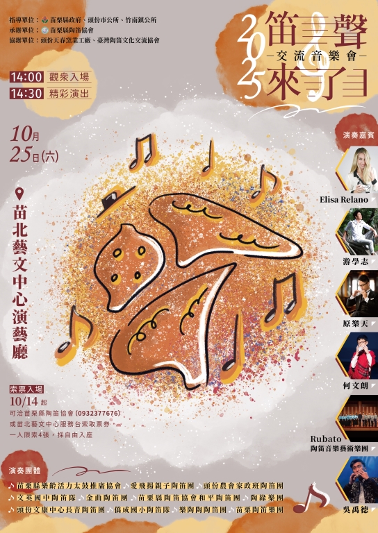 苗栗縣陶笛協會表示,活動呼應教育部「藝術與人文深耕」政策,期望透過跨國交流與在地團隊的舞台呈現,不僅提升學童藝術鑑賞與創作能力,也推動陶笛文化深植人心,讓苗栗成為國際藝術交流的重要舞台。誠摯邀請各方愛樂人士及鄉親們一同前來聆賞,感受一場美妙的音樂饗宴!有關演出訊息可洽苗栗縣陶笛協會/譚國榮總幹事 0932-377676或至苗栗縣政府文化觀光局網站http://www.mlc.gov.tw/藝文資訊/演藝活動查詢。