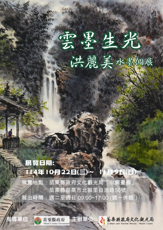 藝術家洪麗美以水墨筆墨抒寫心境與自然的對話,推出個展《雲墨生光》,自114年10月22日至11月9日於苗栗縣政府文化觀光局中興畫廊展出。展覽呈現山水與花鳥系列水墨作品,展現她近年來對自然景物的細膩觀察與情感沉澱。
