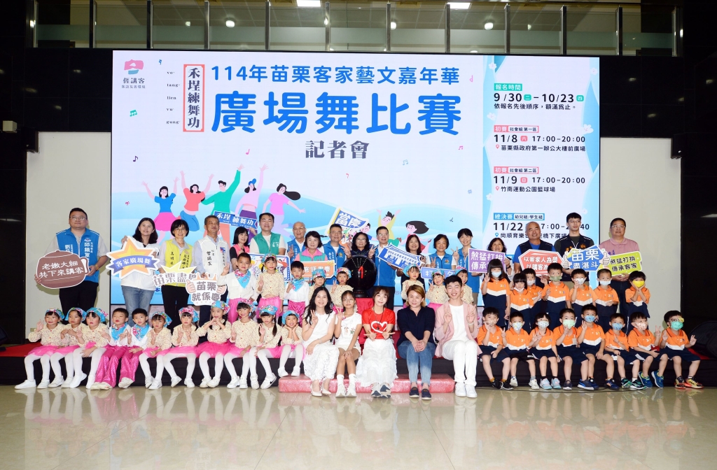為推動客語為通行語計畫,縣府舉辦「114年苗栗客家藝文嘉年華活動-廣場舞比賽」,目前幼兒組額滿,為鼓勵更多人共下來運動,社會組、學生組報名延長至10月31日下午5時止(或額滿為止),歡迎大人細子踴躍報名參賽。